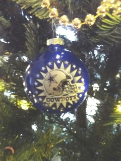 So, after hearing Frank’s groans all season after another interception, fumble, or penalty added to the Cowboys’ mounting collection of misses, imagine my surprise when the first ornament to go on our tree this year was Frank’s Dallas Cowboys blue ornament. He put it there . . . in a prominent spot! No losing streak (not even the lure of the local winning Patriots) can persuade Frank to give up on America’s Team.